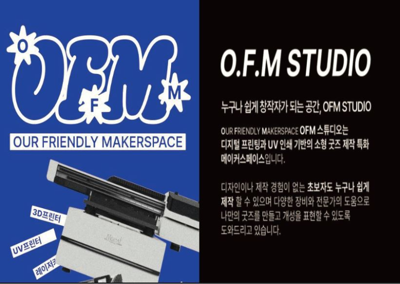 OFM 스튜디오는 디지털프린팅과 UV인쇄 기반의 소형 굿즈 제작 특화 메이커스페이스입니다.