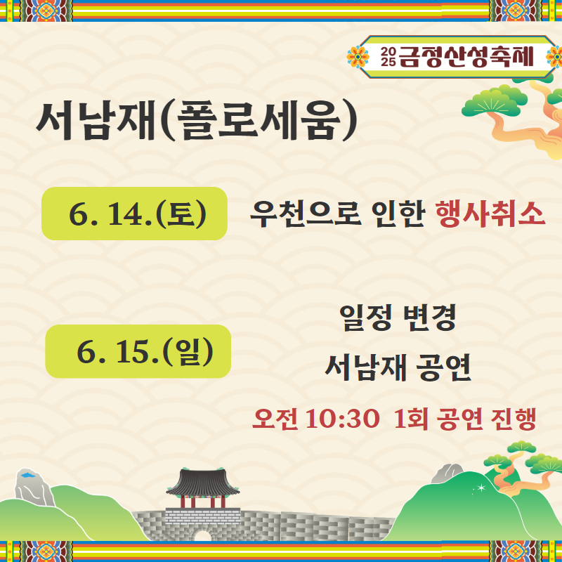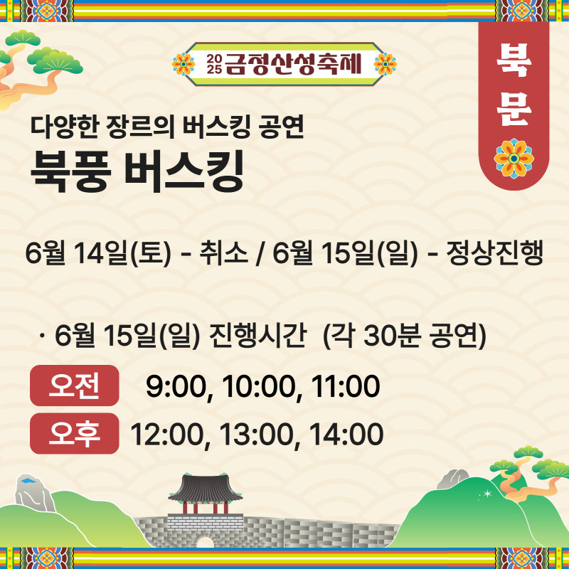 5월 개최 예정이었던 2025 금정산성축제가 6월 13일(금)-15일(일)로 일정이 변경되었습니다.