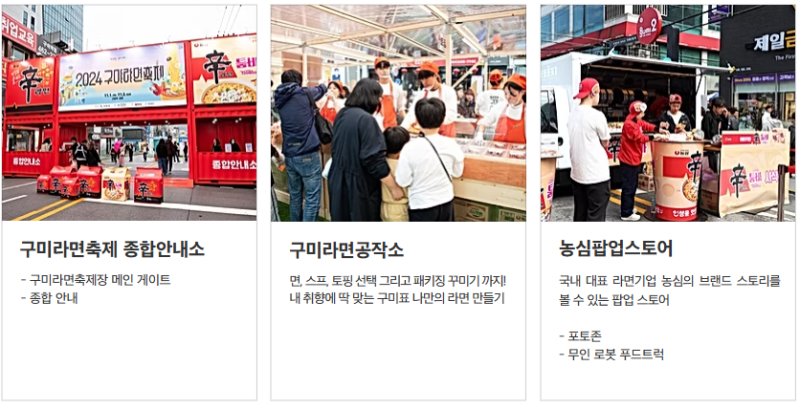 특히, 지역에 있는 생산공장을 통해 갓 튀겨낸 라면을 축제장에서 직접 구매하고 맛 볼 수 있는 전국유일의 라면문화 축제입니다.