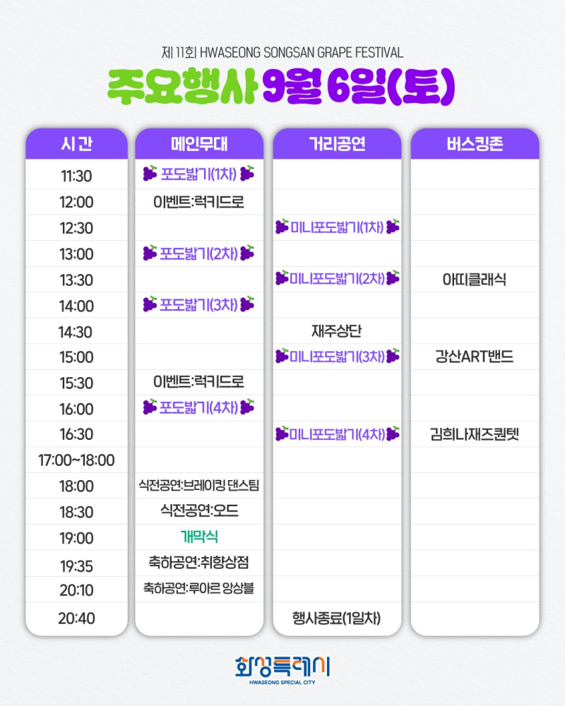 올해 축제는 ‘테이스티 송산(Tasty Songsan)’을 주제로 낙조가 아름다운 궁평항에서 다양한 체험과 먹거리로 관람객들을 맞이한다. 축제기간 동안 동탄호수공원에서는 포도 판촉 행사가 열려 도심 속에서도 화성포도의 깊은 맛과 향을 느껴볼 수 있다.