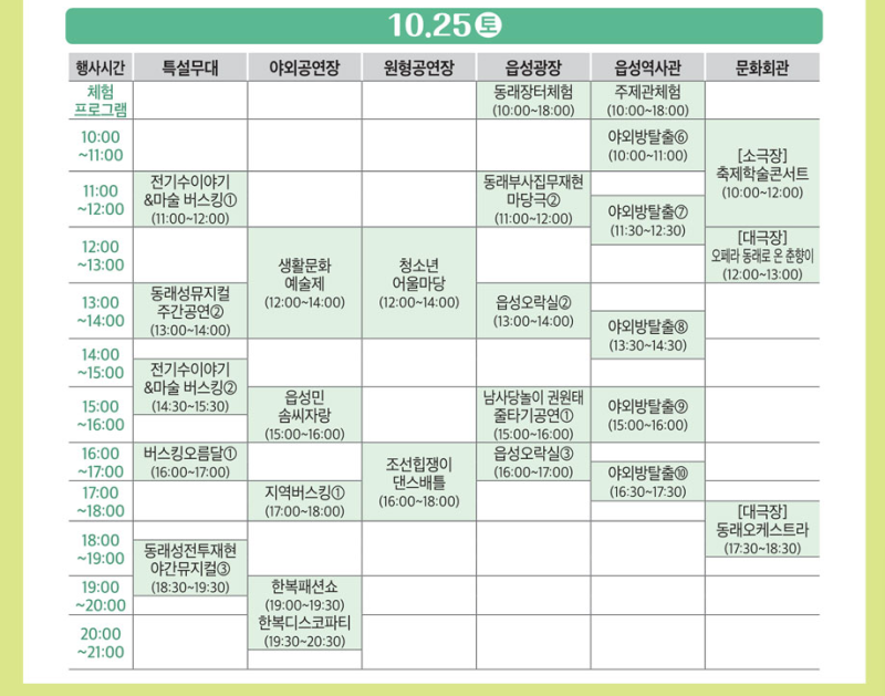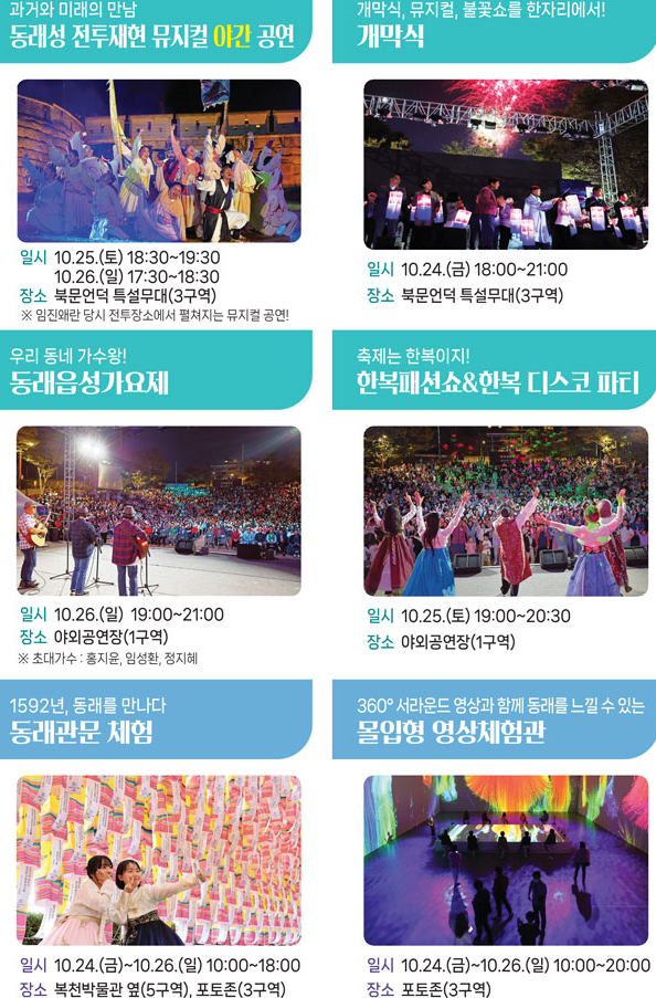 동래읍성역사축제 주제관 체험, 장영실 과학체험, 조선힙쟁이 댄스배틀, 한복디스코파티, 읍성민게임, 읍성오락실, 스탬프 투어, 동래한걸음야행&달빛 티크닉, 동래읍성 따라 걷기, 청소년 어울마당, 동래읍성북페어, 동래 혜민서 체험, 행복마을 도자체험, 송상현 부사 투구 및 갑옷체험, 점자&보치아 체험, 읍성어린이놀이광장, 몰입형 영상체험관, 야외방탈출 ‘동래부사와 마법의씨앗’, 세계전통의상 체험 등 19종