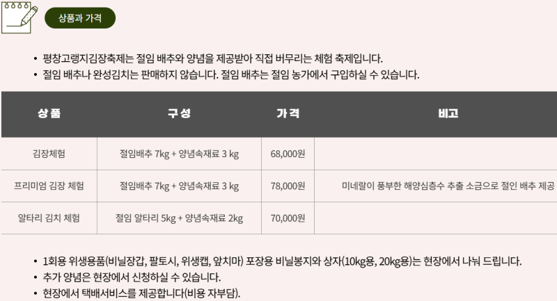 평창고랭지김장축제는 제공된 절임 배추와 양념을 참가자가 직접 버무리는 체험형 축제입니다. 그뿐만 아니라 김장하기에 필요한 비닐장갑과 위생모, 앞치마 팔토시를 제공합니다. 누구나 준비 없이 참가해도 겨울 밥상을 책임질 김장을 할 수 있습니다. 현장에서 택배 서비스도 제공합니다(비용은 자부담).