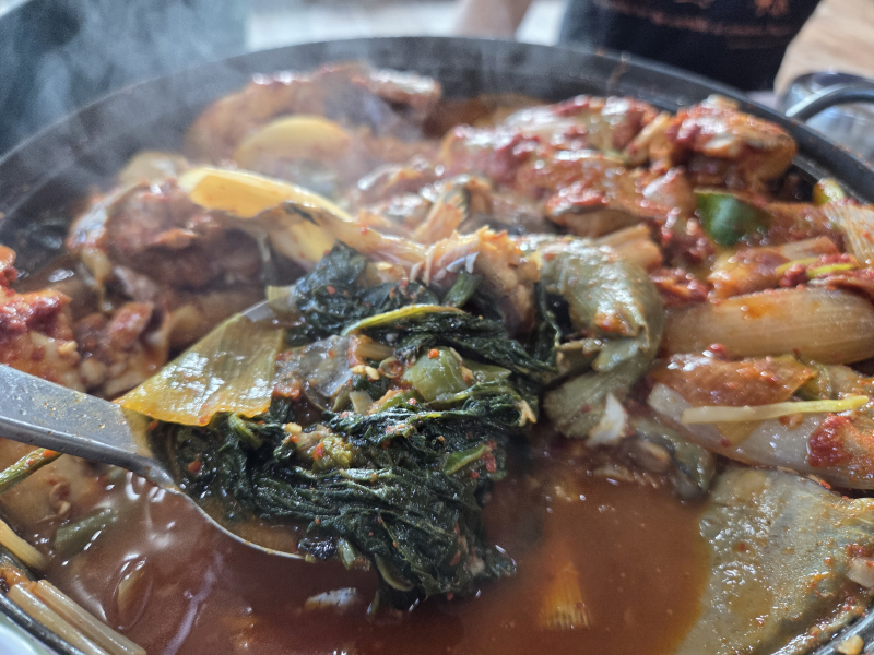 곤드레를 듬뿍 밑바닥에 깔고 그 위에 메기 대가리 중심의 푸짐한 민물고기