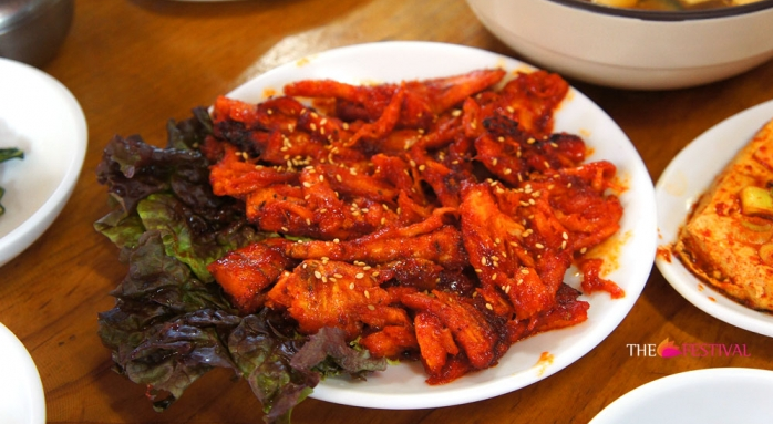 짭쪼롬한 빨간 양념이 일품인 더덕구이! 고소한 맛이 한우 부럽지 않다.