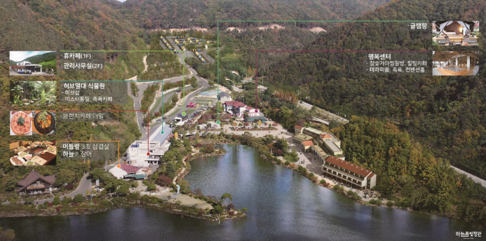 글렘핑 행복센터 찜질방 족욕카페 크레이지카트 허브샵 라이브공연 세미나실