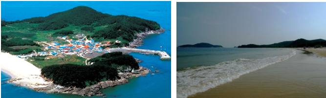선착장에서 내리면 곧바로 해안가에 60여가구의 민박을 전문으로하는 현대식 주택이 자리하고 있으며 마을을 지나 평탄한 작은 구릉을 넘으면 활처럼 휘어진 1.5km의 은백색 해변이 펼쳐져 있어 포근한 느낌을 갖게 한다.