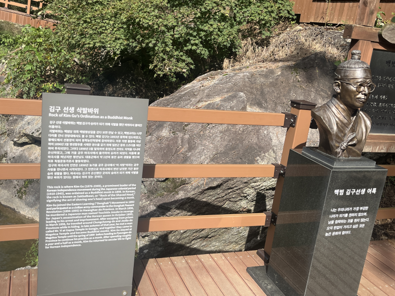 창건당시에는 30여 채를 거느린 큰 사찰이었으나 조일전쟁 당시에 소실되는 아픔을 겪으면서 크게 쇠퇴하였다. 마곡사는 우리의 근 현대사와도 큰 연관이 있는데, 명성황후 시해 사건 이후 울분에 겨워 일본인 장교를 살해하고 형무소에 수감 됐던 김구 선생이 탈옥 이후 3년동안 승려로 지내며 은신을 했던 곳이 바로 마곡사였다. 그때의 인연을 잊지 못한 백범 선생이 해방 이후 다시금 마곡사를찾아 "돌아와 세상을 보니 흡사 꿈속의 일 같구나!"라며 심은 향나무가 극락교 건너 5층석탑 왼편에 위치한 응진전에서 지금도 자라고 있다.