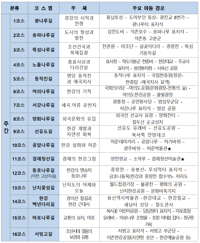 총 16개 코스는 한강의 시간과 장소, 사람의 이야기를 입체적으로 엮어 구성했다. ▲2025년 신설돼 이촌한강공원을 세심하게 조망할 수 있는 ‘서빙고길’▲봄꽃 가득한 잠실과 석촌호수가 어우러진 ‘송파나루길’ ▲사육신공원과 효사정을 중심으로 유교적 가치와 애국충정을 되새기는 ‘노들나루길’ ▲조선의 대표 포구로서 마포의 생활사를 살펴보는 ‘마포나루길’ ▲외국 문화 유입과 격변기의 흔적을 따라가는 ‘양화나루길’ 등이 꼽힌다.