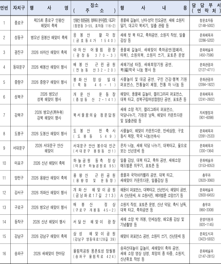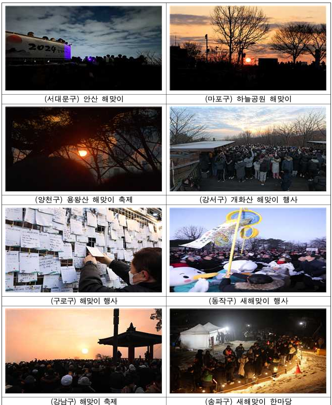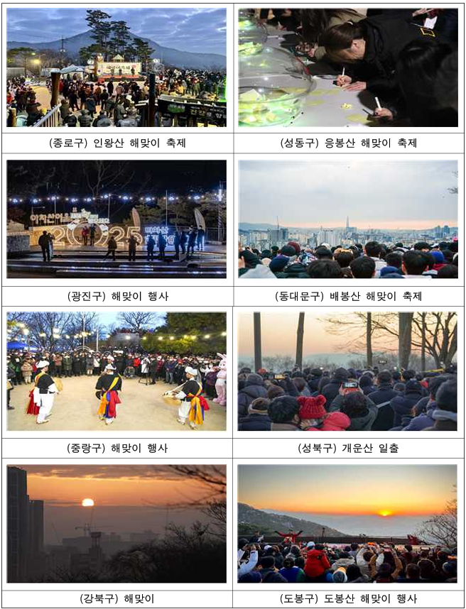 ‘성북구 개운산(개운산 운동장)’에서는 ‘풍물패 길놀이, 캘리그라피 퍼포먼스, 성북구립여성합창단 공연’ 등이 열리고, ‘서대문구 안산(봉수대)’에서는 대형 윷을 활용한 신년운세 이벤트 등이 운영되며, 양천구 용왕산(용왕정 및 운동장)에서는 ‘풍물과 국악 아카펠라 공연, 새해맞이 카운트다운, 일출 감상’ 등의 행사가 진행된다.