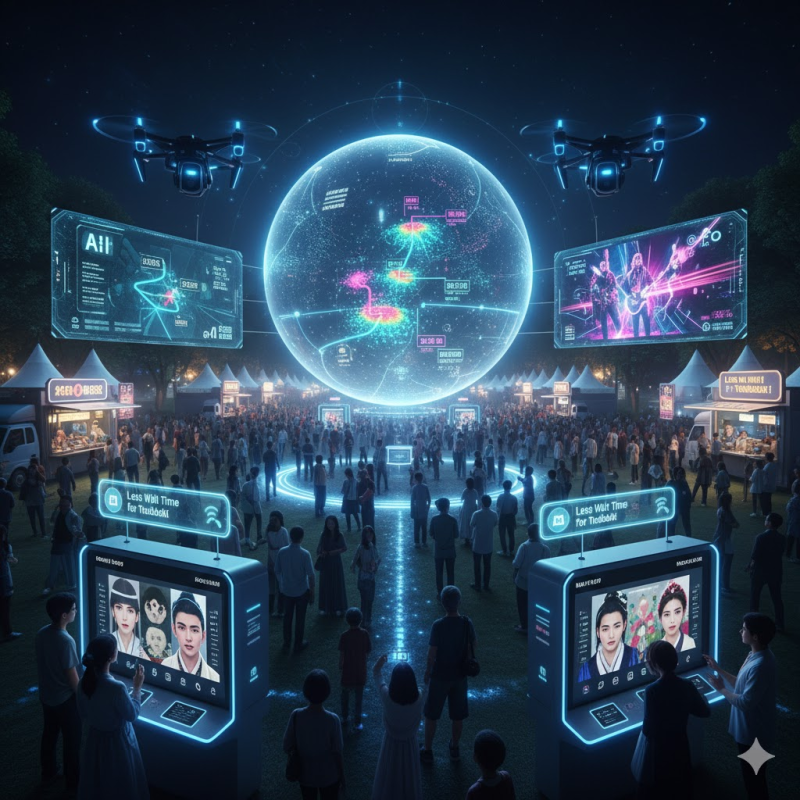 유동 인구가 많은 축제 현장에서 비전 AI는 인파 밀집도를 실시간으로 분석해 압사 사고를 선제적으로 예방하고 미아나 유실물을 신속히 추적한다. 수요 예측 AI는 식재료 낭비를 방지하고 관람객의 대기 시간을 최적화한다. 챗봇 가이드와 개인화 추천 시스템은 개별 관람객에게 최적의 축제 정보를 제공한다. 생성형 AI를 활용한 포토부스나 실시간 작곡 콘텐츠는 축제의 즐거움을 더해 준다.