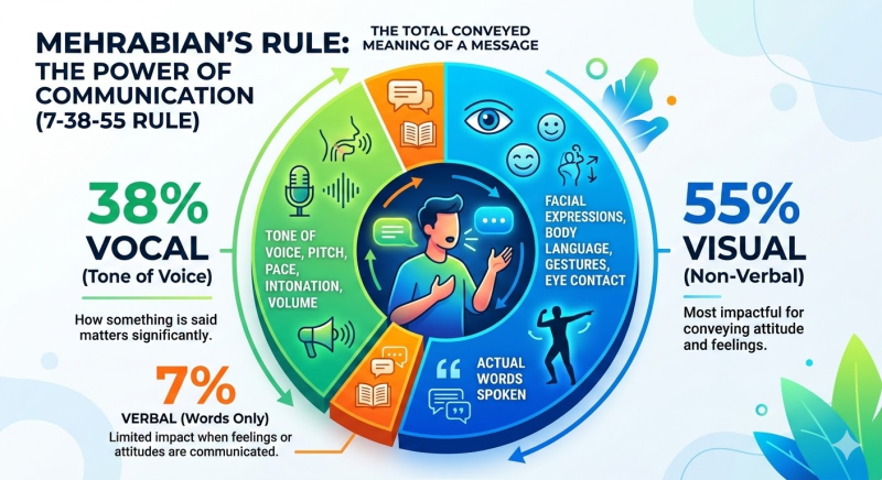 인간의 소통은 말과 글만으로 완성되지 않는다. 심리학자 앨버트 메라비언(Albert Mehrabian)은 감정과 언어가 충돌하는 상황에서 목소리 톤, 표정, 몸짓 같은 비언어적 요소가 메시지 수용에 더 큰 영향을 미친다는 사실을 실험적으로 보여주었다. 다만 이 연구는 감정 표현이 불일치하는 매우 특수한 조건에서 도출된 것으로, 일반적인 소통 전반에 그대로 적용하기에는 무리가 있다. 그럼에도 불구하고, 표정·눈빛·침묵의 간격 등과 같은 비언어적 신호가 맥락 형성에 중요한 역할을 한다는 점은 다양한 커뮤니케이션 연구들이 공통적으로 지지한다.