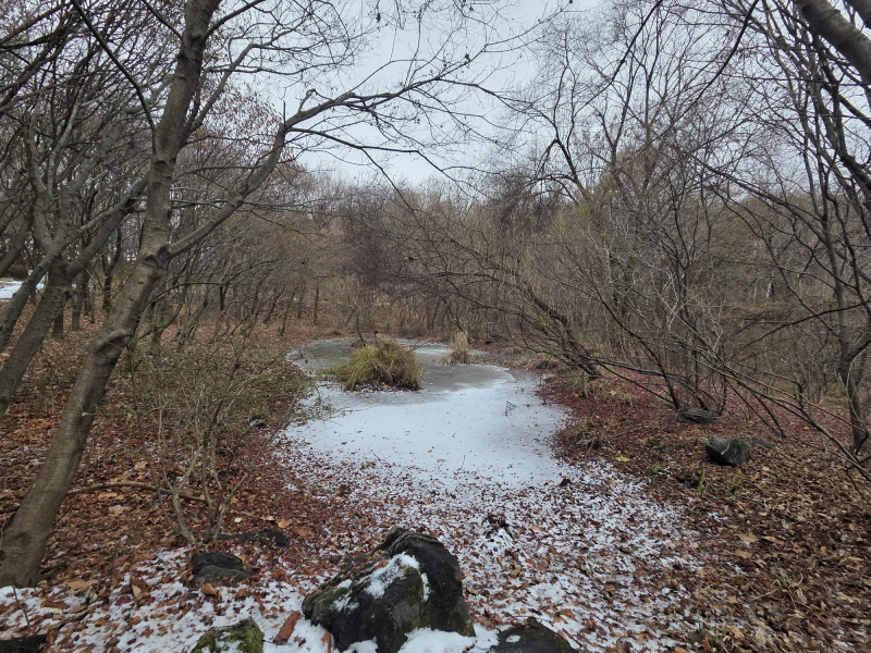 그런데 겨울이라서 꽁꽁 언 연못과 나뭇잎 떨어진 숲길..