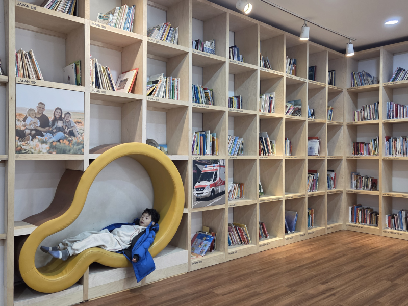 세계 여러나라의 책이 꽂혀 있는 도서관에 들어가 봅니다.