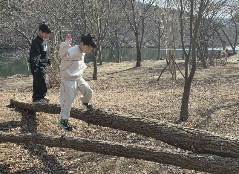 자연스럽게 통나무 위 걷기놀이로 시간을 보냅니다.