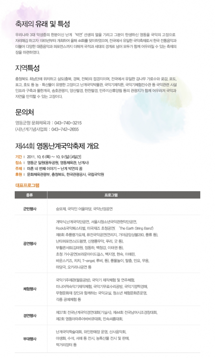 3대악성 (왕산악 우륵 박연) 중 하나인 난계 박연의 뜻을 기리는 충북영동의 예술축제