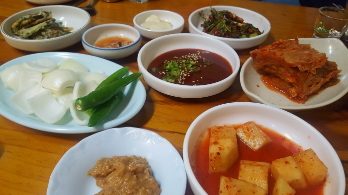 중요한 게 홍어삼합의 맛인데 새콤한 발효홍어와 부드러운 돼지고기 수육 그리고 아삭새콤한 묵은지의 궁합이 찰떡같이 잘 맞습니다. 고추 양파 된장 새우젓 오이소배기 깍두기 양념장 부추전 .. 모두 입에 맞습니다. 누구 입에도 맞습니다.