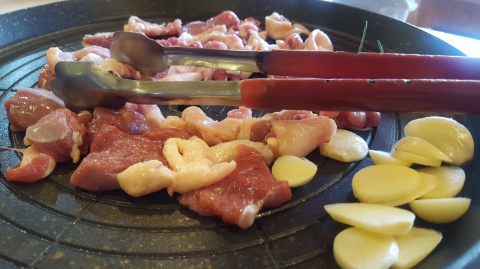 쌈밥은 유기농 신선한 야채에 소고기 돼지고기 오리고기 중에서 골라 싸 먹는 것이다.