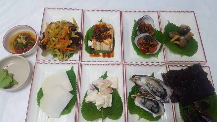 해산물의 제철 재료를 골고루갖추어 놓고 서비스를 합니다.