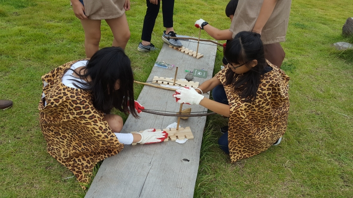 불붙이기 체험을 생생문화재 프로그램에 참여한 어린이들이 하고 있다.